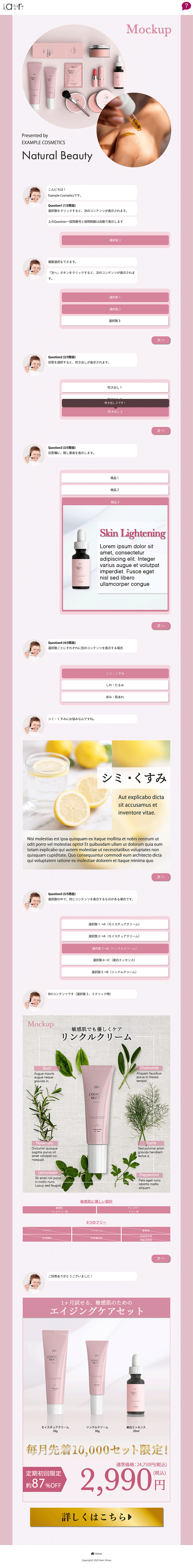 少しずつ形を変えた様々なこのチャットボット風アンケート型LPを、数社のクライアント様(化粧品メーカー)のご依頼で数十本制作いたしました。